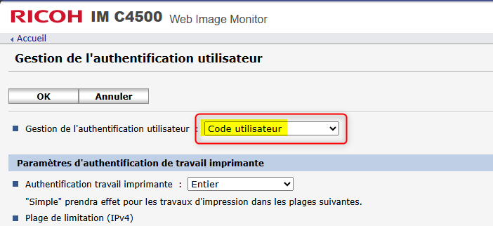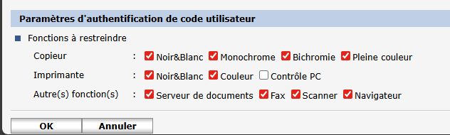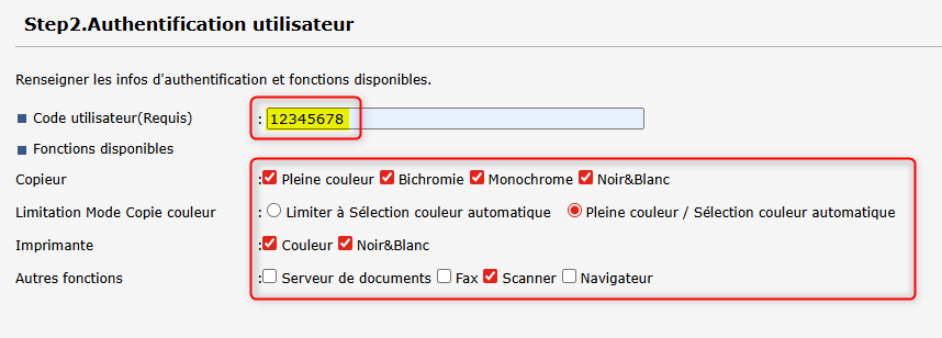 /!\ A partir du moment où l'authentification utilisateur est activée, les fonctionnalités du copieur requièrent systématiquement un code utilisateur.