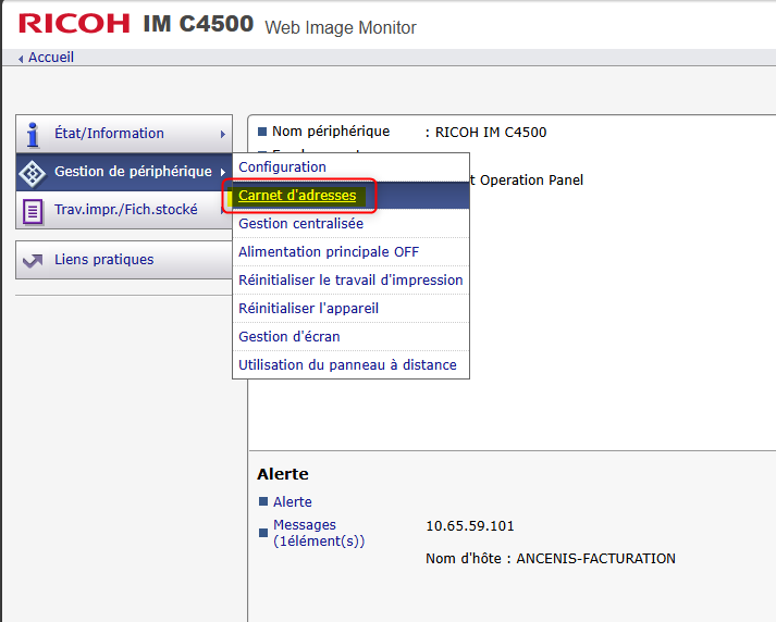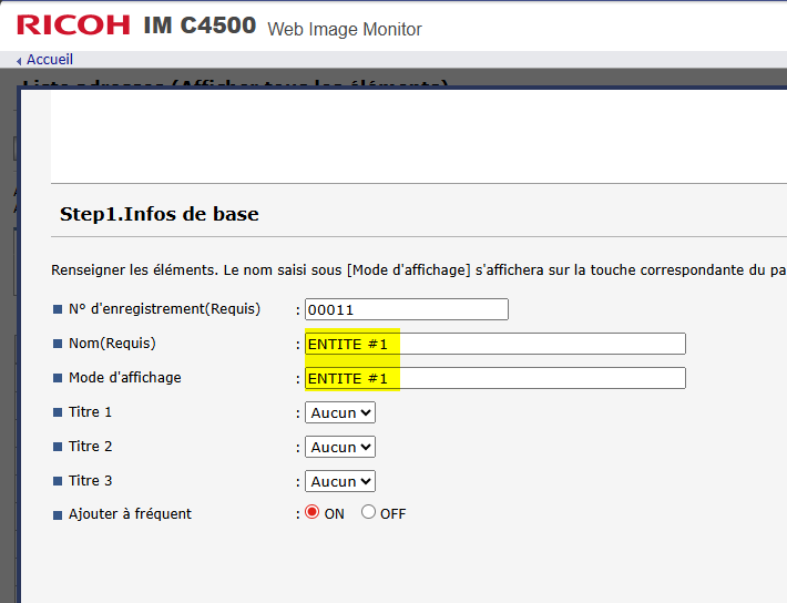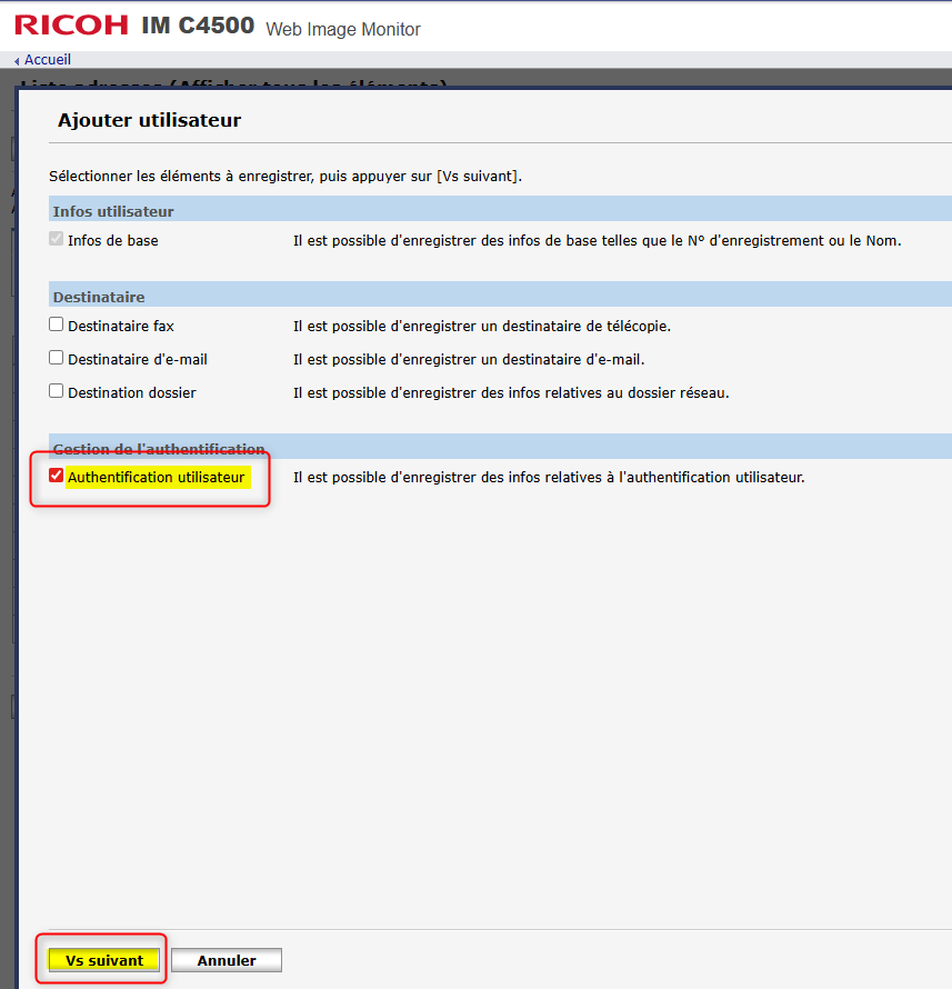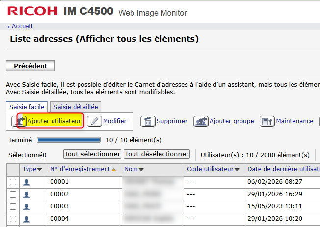 Il faut se rendre dans le Carnet d'adresses du copieur et créer un utilisateur spécifique.