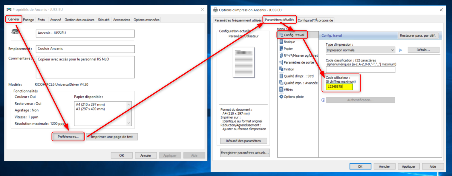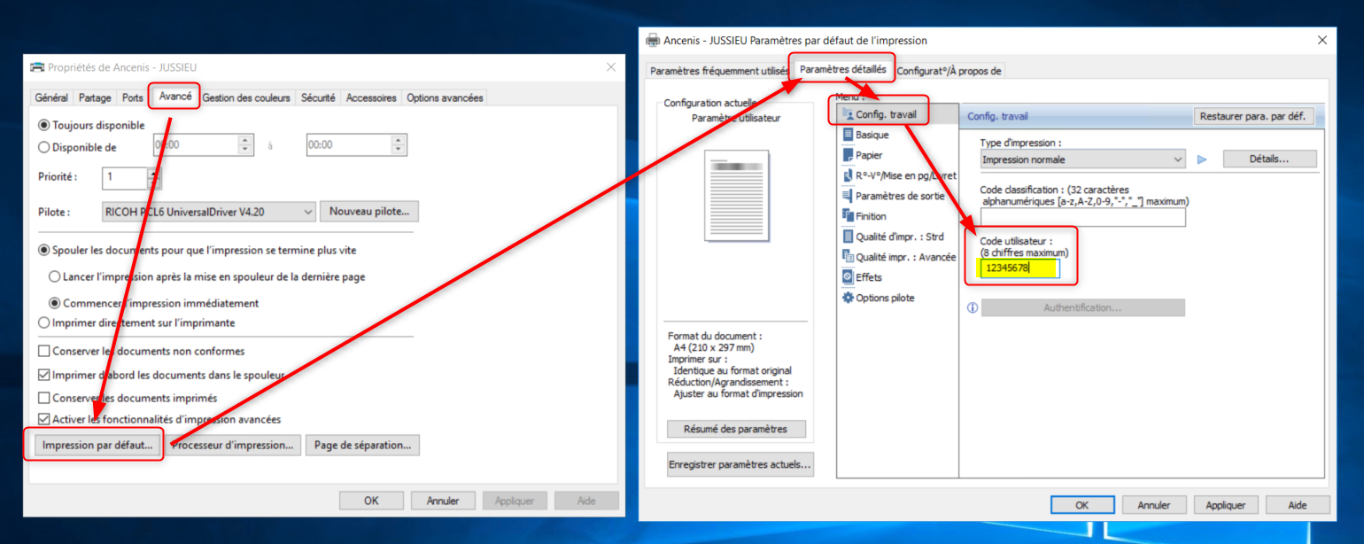 Pour éviter de devoir saisir le code à chaque impression, on le paramètre directement dans le pilote du copieur.