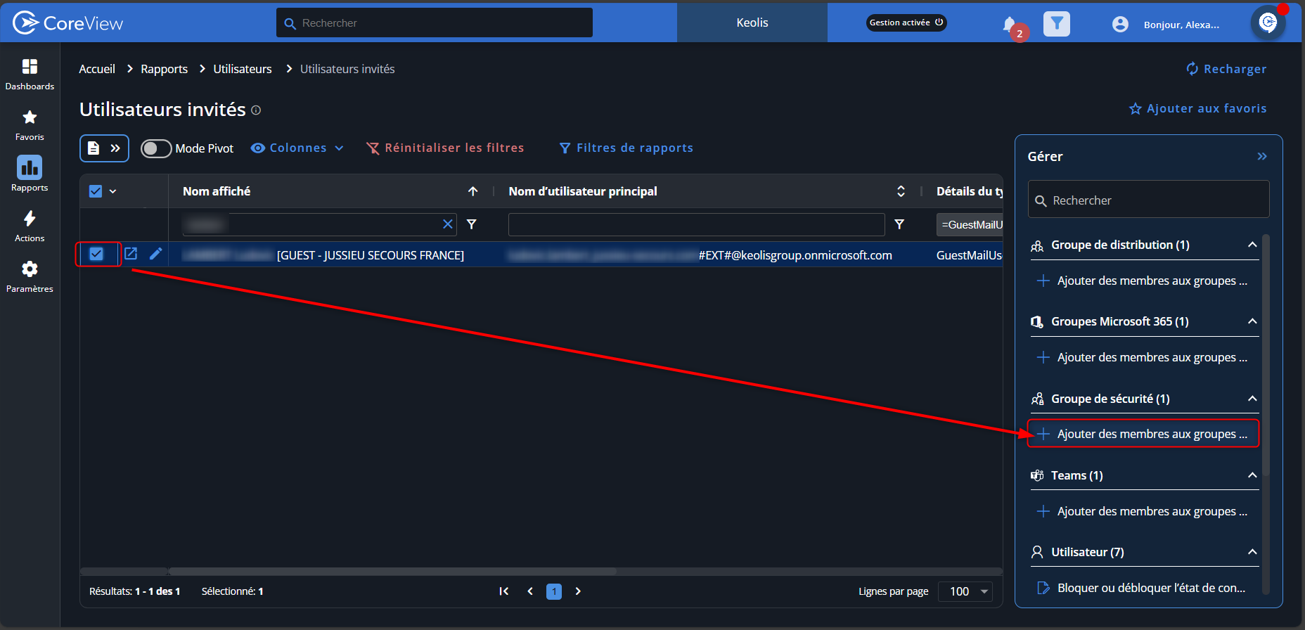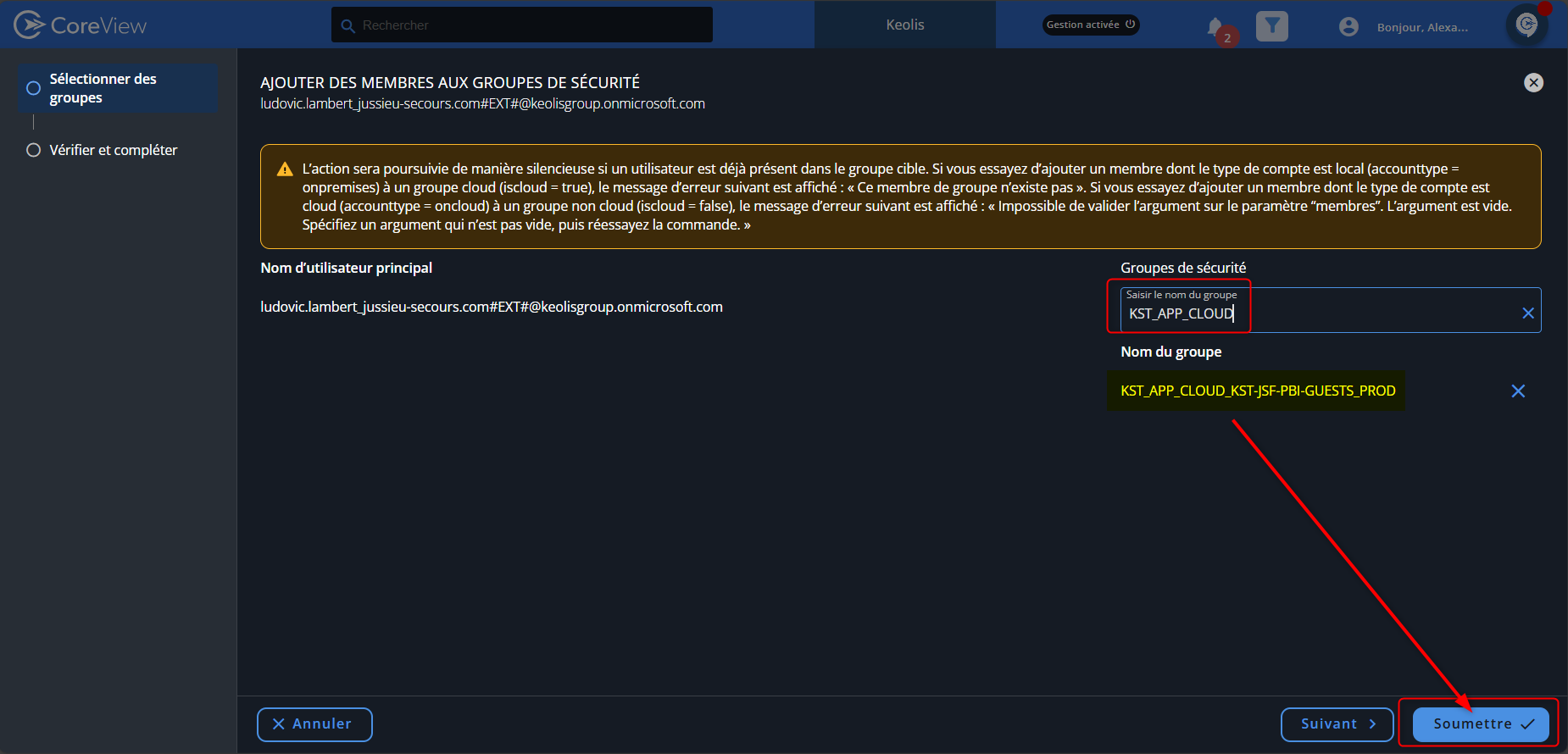 Puis sélectionner le compte et, dans les actions disponibles (à droite), l'ajouter au groupe suivant KST_APP_CLOUD_KST-JSF-PBI-GUESTS_PROD