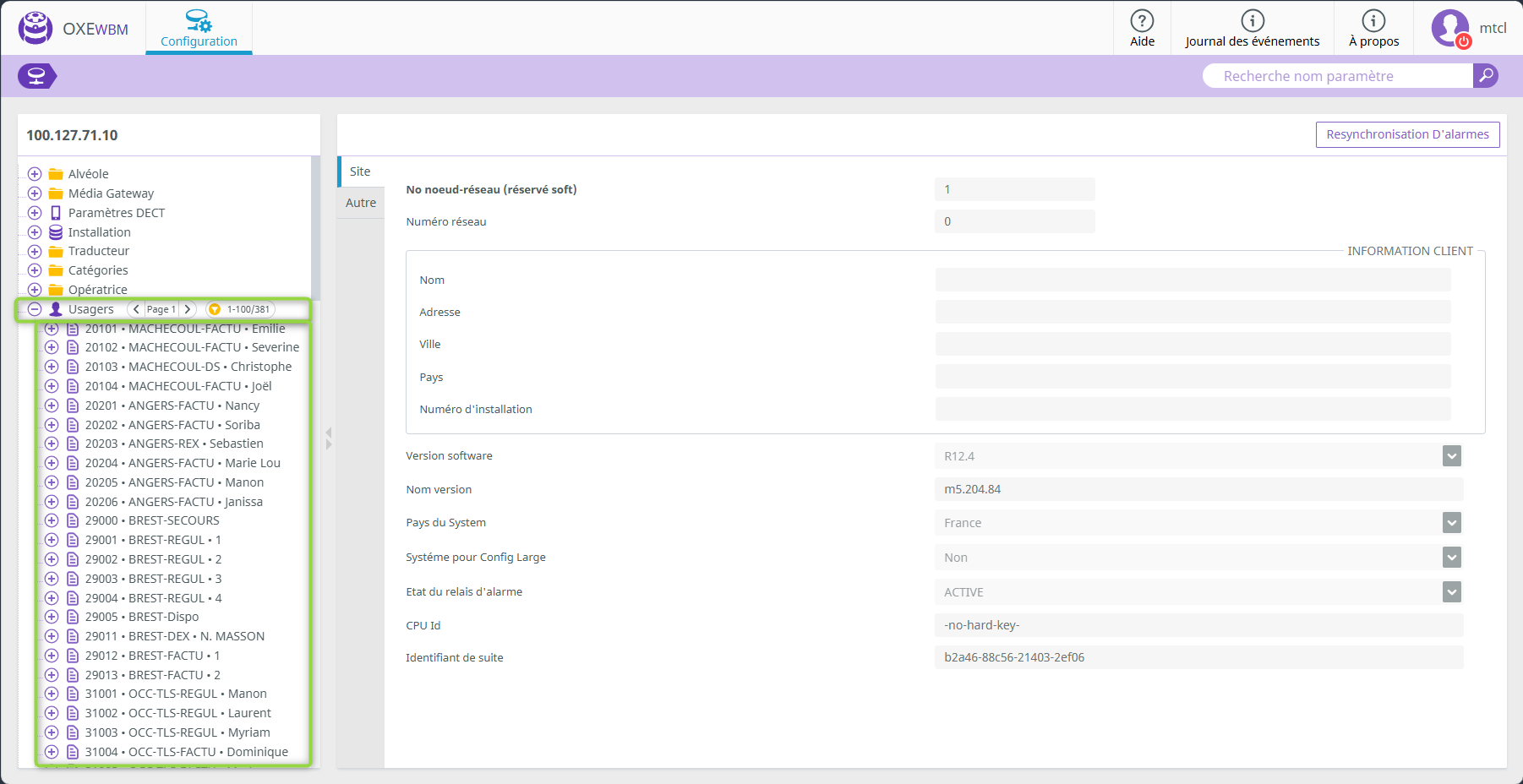 - Dans le menu latéral cliquez sur Usagers puis recherchez le numéro du softphone dans la liste