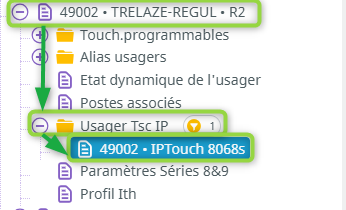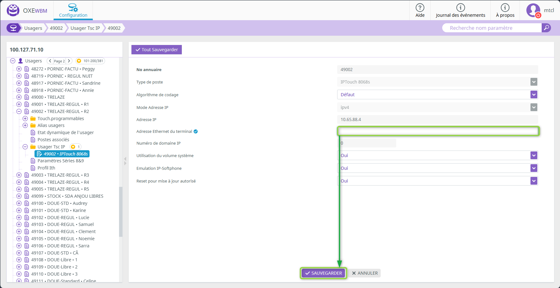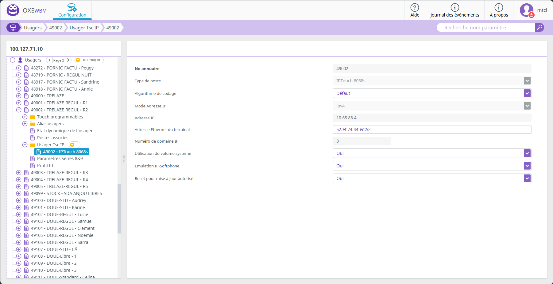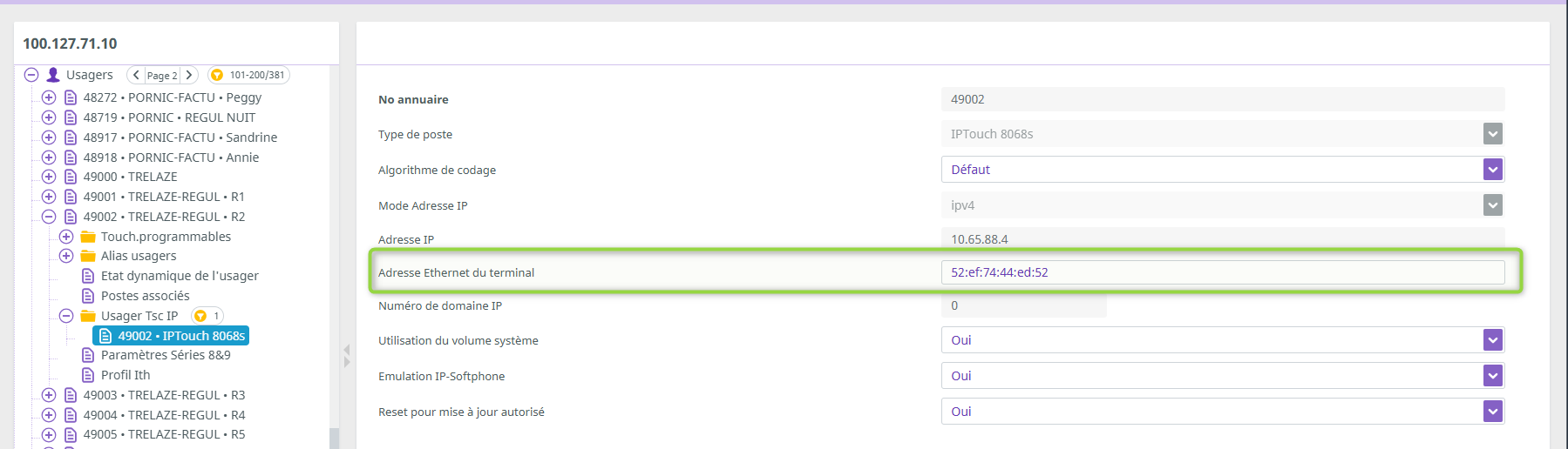 - Ensuite développez la fiche du softphone puis cliquez sur Usager Tsc IP et ensuite sur la fiche du softphone